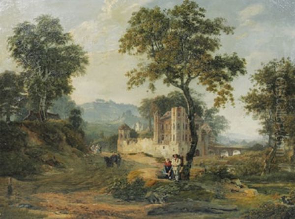 Romantische Waldlandschaft Mit Rastenden Bauern Und Wanderer Vor Einem Schlos