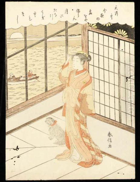 A Courtesan And Her Dog On A Veranda Overlooking A Bay