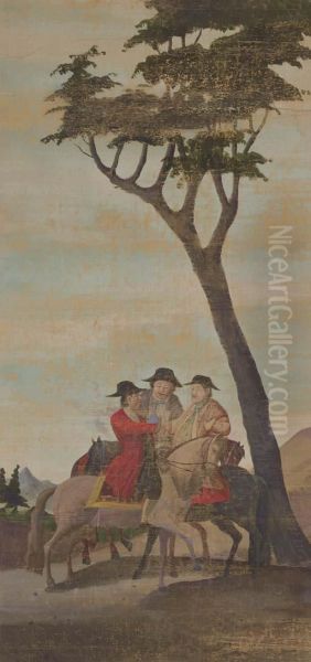 Three Europeans On Horseback In Landscape
