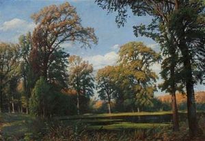Landscape With Meadow And Ducks, Trees In Background, Hills In Far Distance