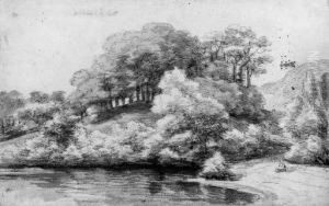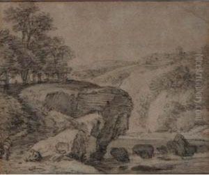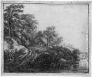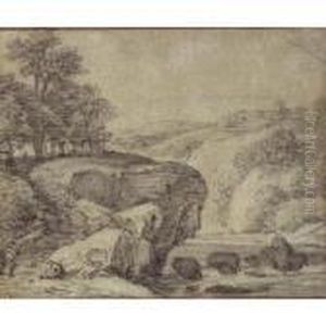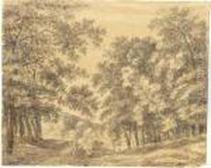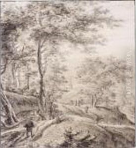 A Wooded Landscape With A Herd Of Pigs On A Track