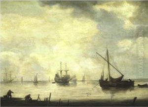 A Calm: Fishermen At Work On A Sandbank With A Wijdschipapproaching A Harbour Nearby, Other Shipping Beyond, At Dawn