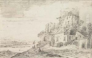 An Estuary Scene With A Rocky Coastline On The Left And Fishermen On The Shore, Men-'o-war In The Background