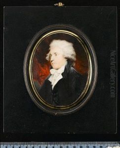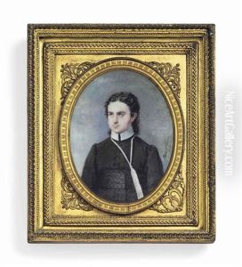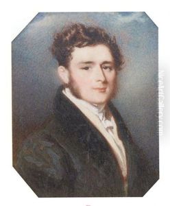A Young Gentleman, In Black Coat, White Shirt, Black Tied Cravat, Dark Curling Hair And Sideburns; Red Curtain Background