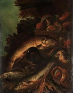 A Still Life Of Apples, Mushrooms Andflowers