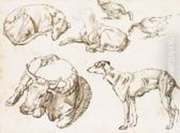 Etudes De Trois Levriers, Une Vache Et Deux Oies