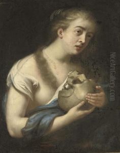 Portrait of Queen Henrietta Maria, small three-quarter-length, in a dark blue dress, holding a rose