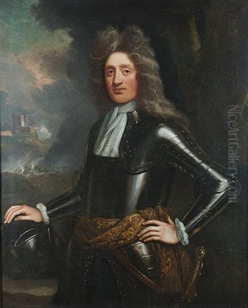Portrait Of A Gentleman, Standing Three-quarter-length, In Armour, His Right Hand Resting On A Helmet, A View To A Cavalry Battle Beyond