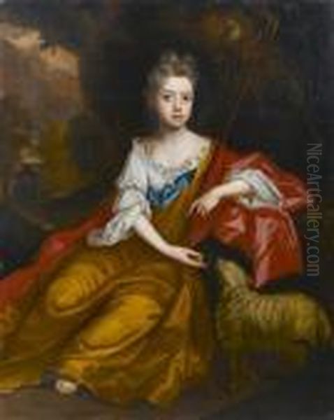Portrait Of A Young Girl As A Shepherdess, In A Gold Dress With A White Chemise And A Scarlet Wrap, Seated In A Landscape Beside A Lamb
