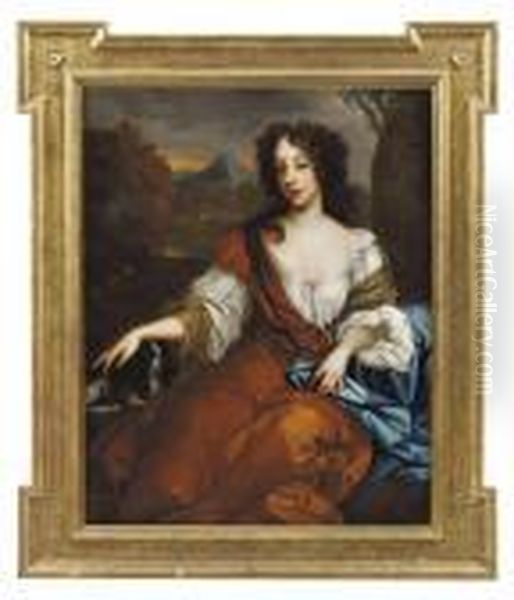 Portrait Of Mary Of Modena, Queen Of King James Ii,three-quarter-length, Seated, In An Ochre Dress And Blue Wrap, Witha Dog Beside Her, Her Right Hand Resting On A Spaniel