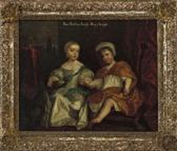 Portrait Of Two Children, Traditionally Identified As Princecharles (1630-1685) And Princess Mary (1631-1660), Seatedfull-length In White Gowns, She With A Blue Wrap And He With A Goldcloak, A Dog At Their Side, With A Cushion Curtain Background