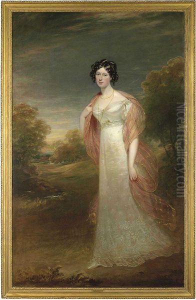 Portrait Of Ann Maria Harriet De Rhodes (1793-1849), Full-length, In A White Dress And Pink Chiffon Wrap, A Wooded Landscape Beyond