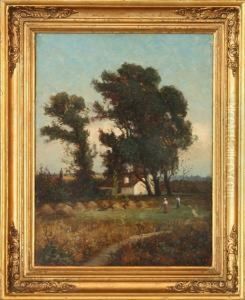 Sittende Kvinne I Landskap Med Hus Og Aker