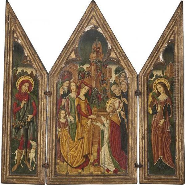 A Triptych: A Lady Presenting A Monstrance To A Bishop Saint, A Castle Being Stormed Beyond (central Panel); A Female Saint (right Wing); And A Male Saint (left Wing)
