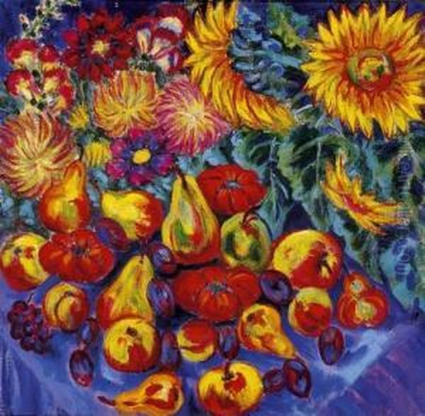 Sunflowers, Chrysanthemums And Fruit