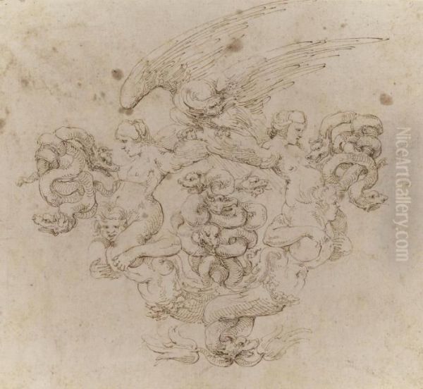 A Cartouche In The Form Of Two Mermen With Intertwined Tails Supporting Harpies Whose Wings Support An Eagle, With Pairs Of Writhing Serpents At Either Side And With A Group Of Four Intertwined Serpents In The Centre