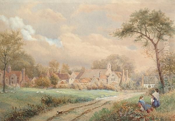 Figures Resting By A Country Lane With Cottages In The Distance