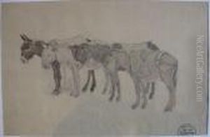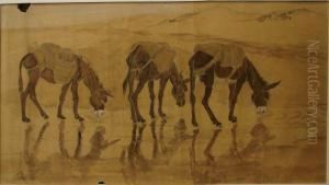 Trois Anes S'abreuvant Dans Un Oued