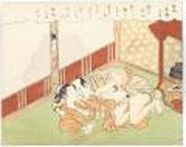 An Older Woman Crouched Behind A Partially Open Shoji Spying Upon A Couple Making Love