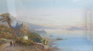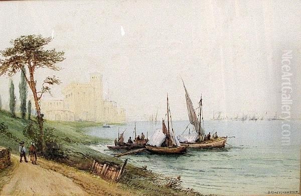Fishing Boats Along A Shore, A Harbor Beyond