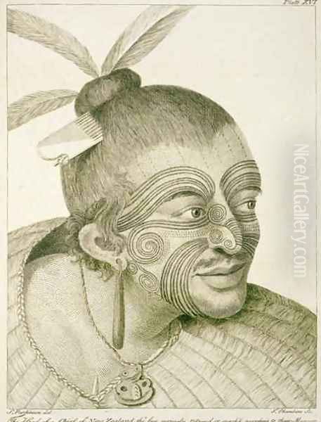 The head of a chief of New Zealand, the face curiously tataow'd, or marked according to their manner. From Journal of a Voyage to the South Seas, 1784
