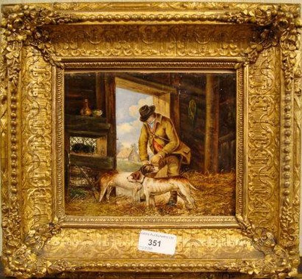 An Interior Of A Barn With A Huntsman Leashing His Hounds