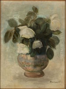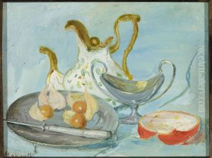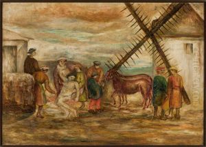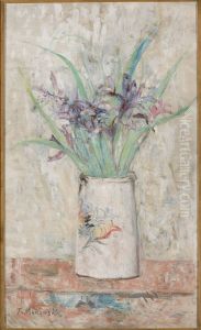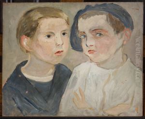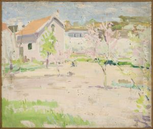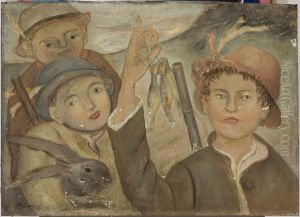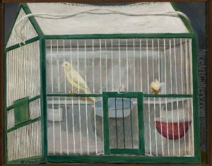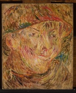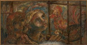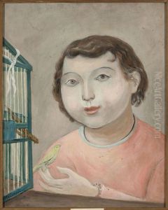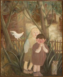 Idyll beside a fence (Self-portrait, girl with flowers and dog)