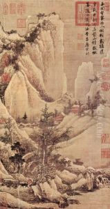 Importante Peinture Tendue Sur Chassis Au Lavis Sur Papier Representant Un Tigre Blanc Jouant Avec Son Petit Sous L'oeil D'un Singe Perche Sur Un Rocher ; Au Second Plan, Un Paysage De Montagnes Et Cascade. Sur Le Front Des Deux Felins, Figure Le