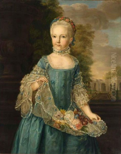 A Portrait Of Adriana Petronella Gravin Van Nassau Woudenberg (1757-1789), Aged 8, Standing Three-quarter Length, Wearing A Blue Dress With White Lace Cuffs, Holding Flowers In Her Apron, In A Landscape