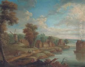 A Lakeside Village, With A Carriage And Mounted Figures On Theshore, A Wooded Landscape Beyond