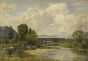 Bauerin Bei Ruderbooten Am Bachufer