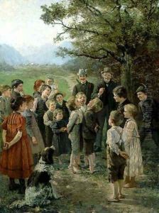 Zwei Lesende Kinder Und Ein Dackel Vor Einem Steinmarterl