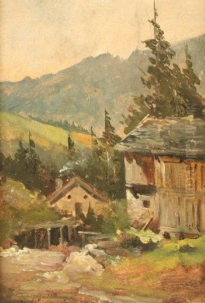 Theodor (deutscherlandschaftsmaler, Gest.1929, Sohn Des Historienmalers Thomasguggenberger), "bauernhaus Am Gebirgsbach", Ol Auf Malkarton, 24 X17, Unten Links Signiert, R.
