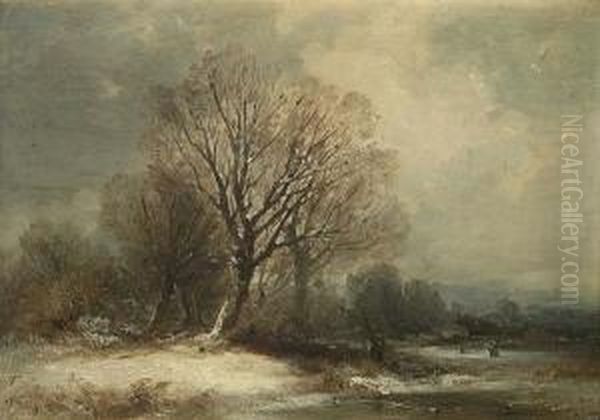 "romantische Verschneite Fluslandschaft" Mit Personenstaffage, Oben Ein Kleiner Kratzer
