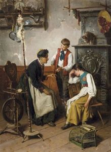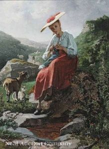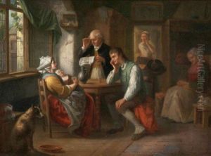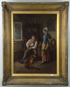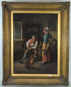 Landliche Idylle - Genreszenerie Einer Bauernstube Mit Zwei Stickenden Madchen Und Jagdhund
