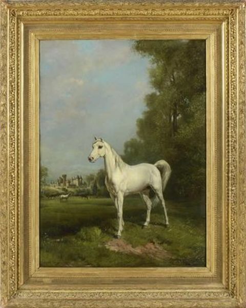 Portrait De Cheval Au Pre Devant Un Chateau