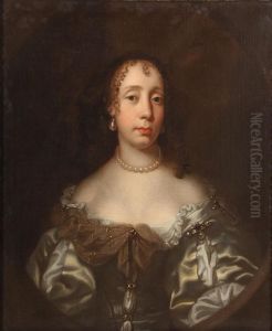 Portrait Of Lady Alice Villiers Wearing A White Silk Dress With Jewelled Bodice And Pearl Necklace And Earrings