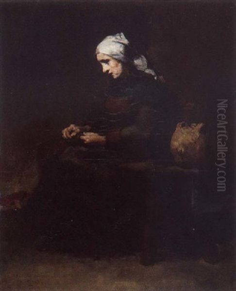 La Ravaudeuse Oil Painting by Theodule Augustine Ribot