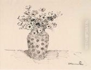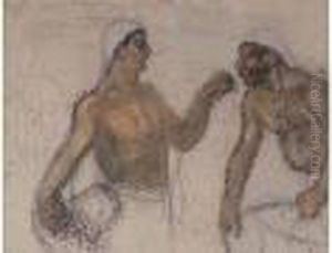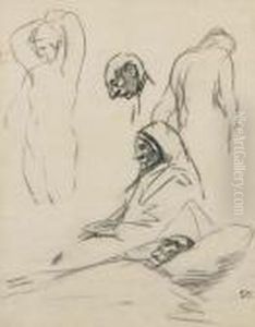 A Charcoal Study Of Two Men Together With Five Pen And Ink Drawings