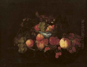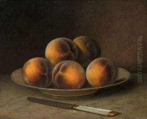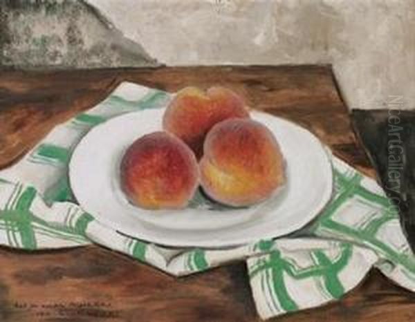 Stilleben Mit Drei Pfirsichen Auf Einem Teller.