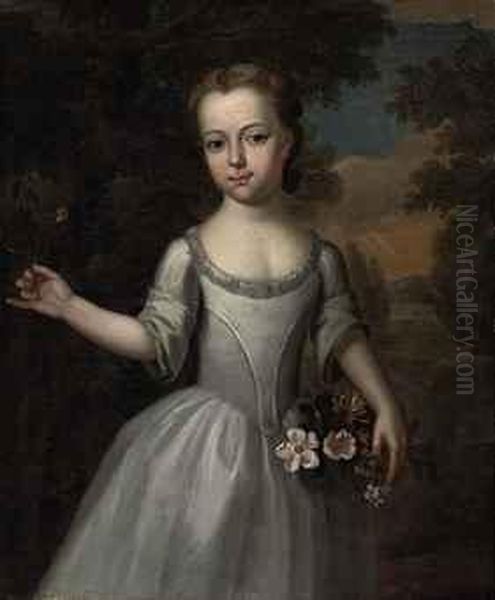 Portrait Of A Young Girl, Three-quarter-length, In A Grey Dress With A Basket Of Flowers In A Landscape