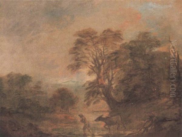 Landscape With A Rustic Leading A Donkey Across A Stream At Dusk