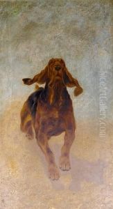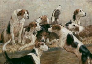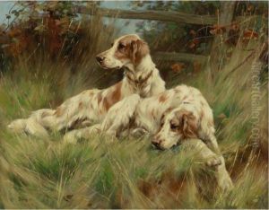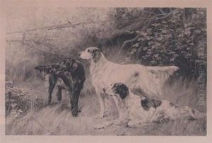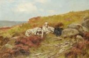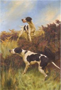 Hunting Dogs Watching A Nest By A Rock In A Moorland Landscape
