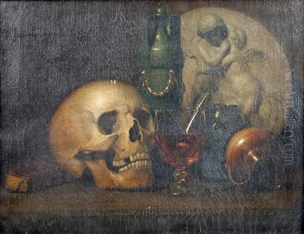 A Vanitas Still Life, With A Skull, A Roemer, A Green Vase, And A Marble Plaque With Putti Embracing
