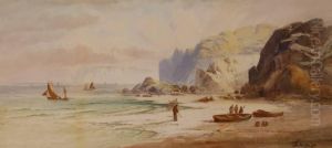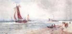 Fishing Boats And A Paddle Steamer Offreculver. Watercolour, Signed And Dated 1878.