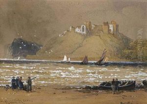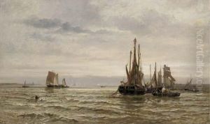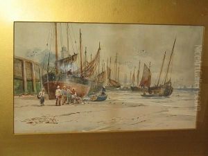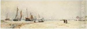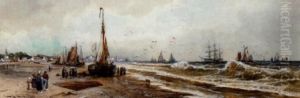 British, Figureson A Sandy Beach With Fish Smacks Off Shore