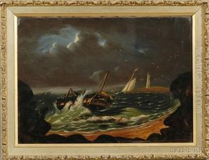 Shipwreck Off A Rocky Coast With Distant Lighthouse