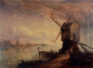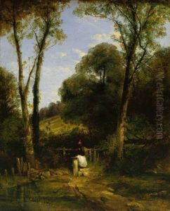 A Countrywoman On A Lane In An Estensive Wooded Landscape With A Windmill And A Church