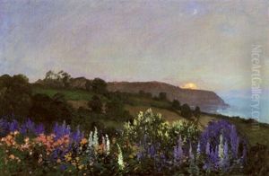 Delphiniums On A Hillside At Sunset