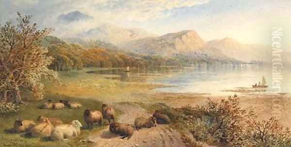 Sheep resting beside a Lake in a mountainous Landscape